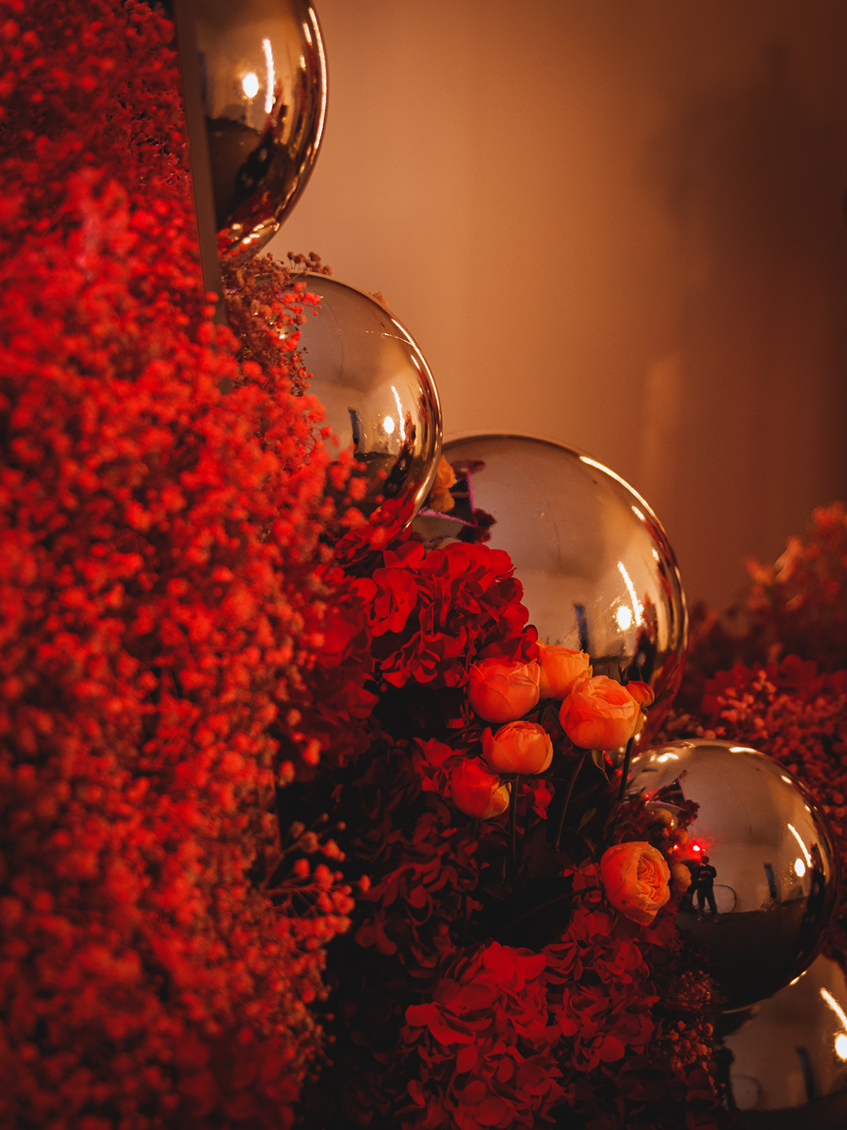 미러오브제와 함께 연출된 비정형 형태의 화려한 플라워와 오너먼트는 시각적 임팩트를 더해 강렬한이미지를 생성한다.
